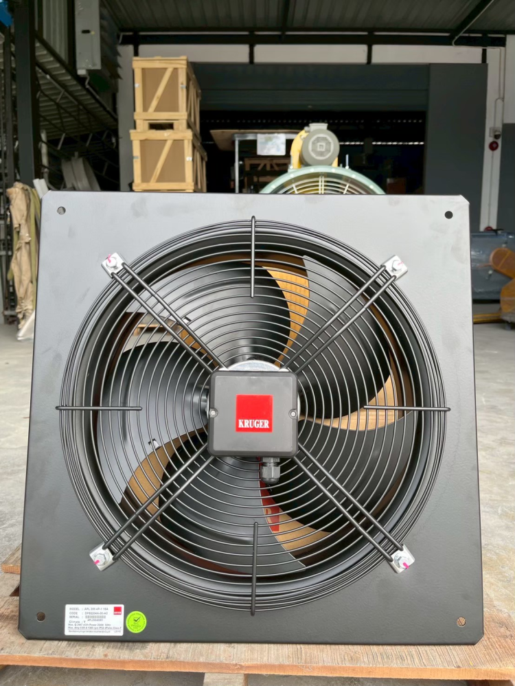 ใบพัดโลหะที่โค้ง จะช่วยลดเสียงและเพิ่มประสิทธิภาพการไหลของอากาศ แบรนด์ KRUGER เป็นแบรนด์ที่นิยมในงานระบบ HVAC และโรงงานอุตสาหกรรม เพราะขึ้นชื่อเรื่องความทนทาน การติดตั้งพัดลมแบบนี้ควรเผื่อพื้นที่ด้านหลัง เพื่อให้มอเตอร์ระบายความร้อนได้ดี