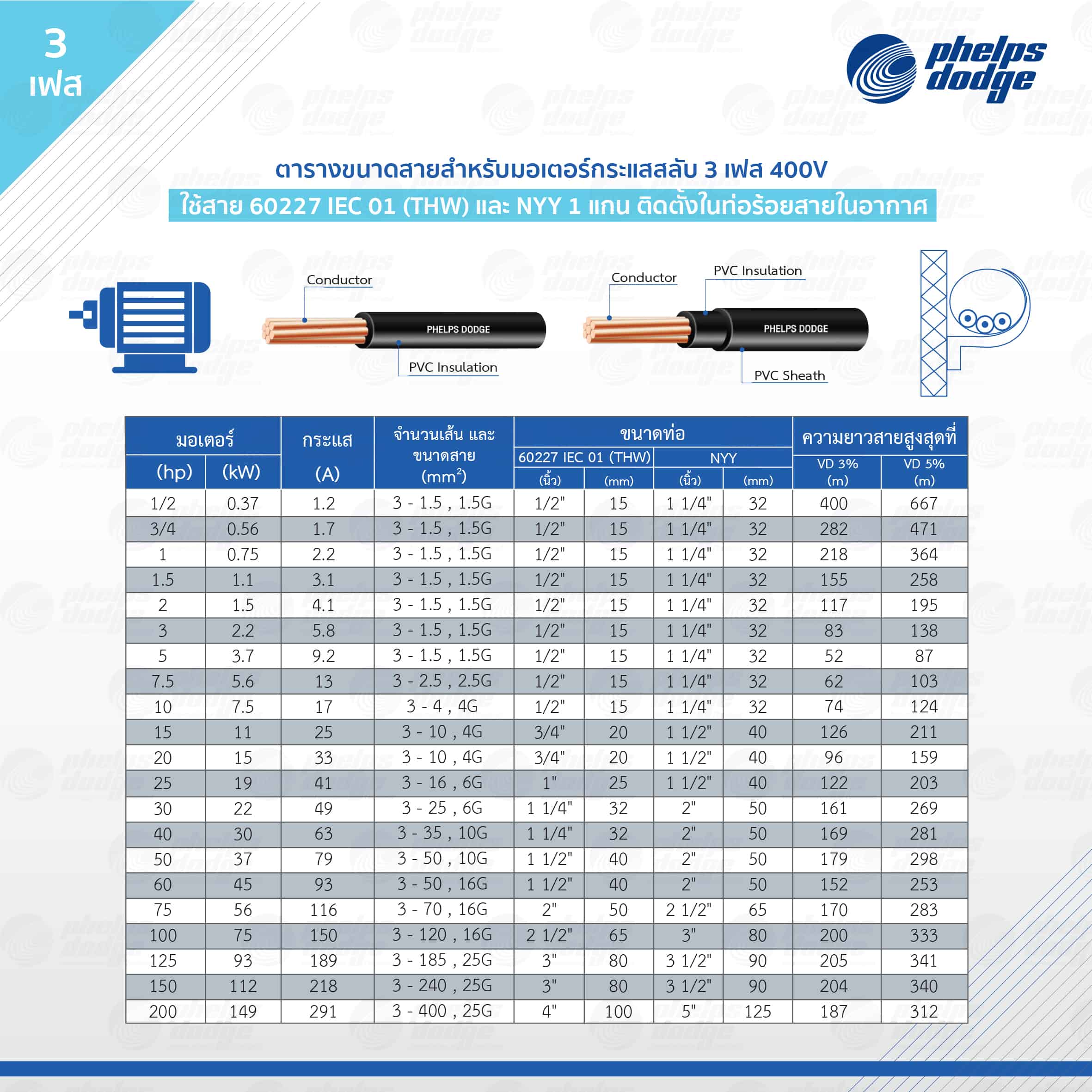 ต้องดูหลายปัจจัย แต่หลักง่าย ๆ ที่ใช้กันในงานทั่วไปคือดูจาก กำลังมอเตอร์ (แรงม้า / HP) แล้วเทียบกับ กระแสไฟ (Amp) และเลือก ขนาดสายไฟ (ตร.มม. / mm²) ให้รองรับกระแสได้มากกว่าเล็กน้อย เพื่อความปลอดภัยและไม่ให้สายร้อนเกินไป 🔧⚡