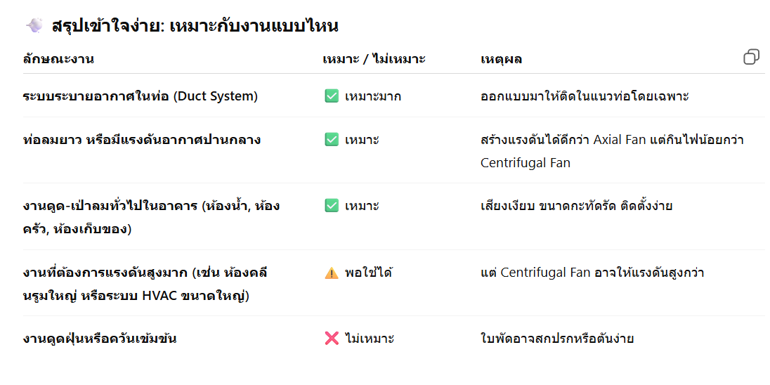 - เหมาะกับ ระบบระบายอากาศในอาคาร, ห้องน้ำ, ห้องครัว, โกดัง, ร้านอาหาร, โรงงานเบา