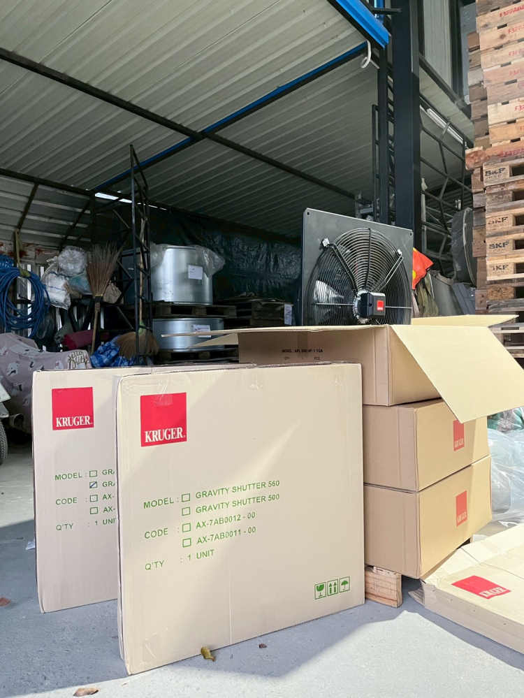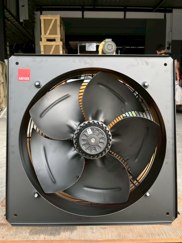 ใบพัดโลหะที่โค้ง จะช่วยลดเสียงและเพิ่มประสิทธิภาพการไหลของอากาศ แบรนด์ KRUGER เป็นแบรนด์ที่นิยมในงานระบบ HVAC และโรงงานอุตสาหกรรม เพราะขึ้นชื่อเรื่องความทนทาน การติดตั้งพัดลมแบบนี้ควรเผื่อพื้นที่ด้านหลัง เพื่อให้มอเตอร์ระบายความร้อนได้ดี